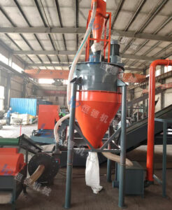 成品胶粉通过风机风力作用经管道送入旋风分离器,进入储物袋。设备还设有自动输送和自动除尘系统,提高生产效率和工作环境的清洁度。